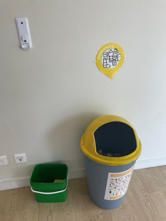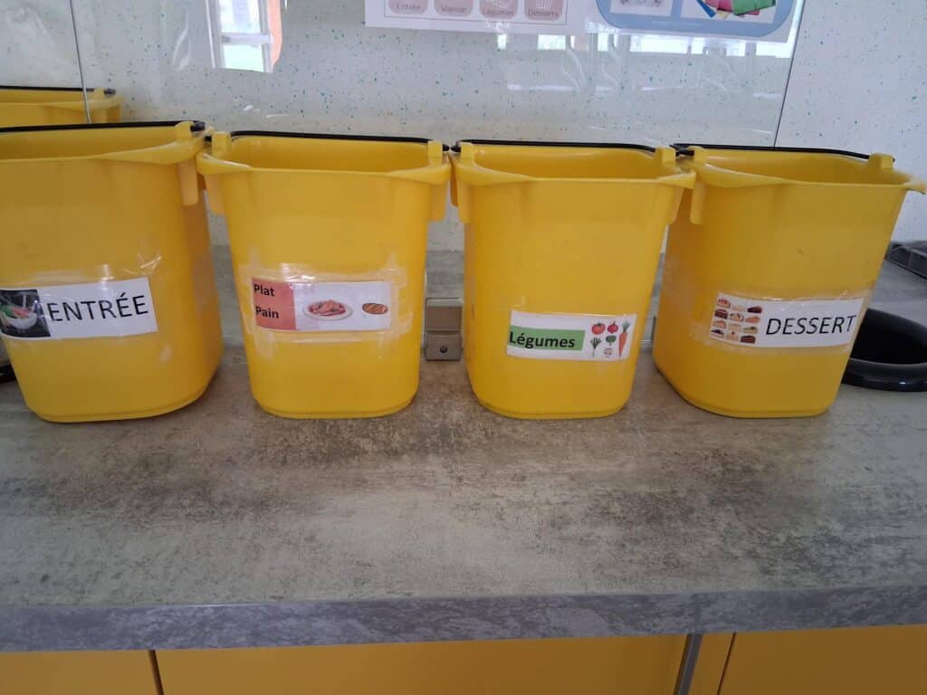 Dans les salles à manger, des dispositifs concrets et adaptés ont été installés : une poubelle jaune pour les emballages recyclables (plastiques, cartons) et un bac vert dédié aux déchets alimentaires.