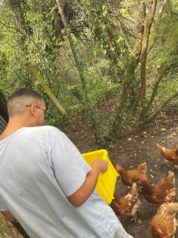 - Damien apprécie « d’amener le compost aux poules quand il le peut ».