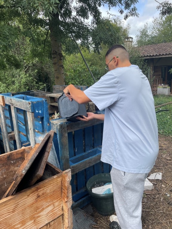 Mais le tri ne s’arrête pas là… les déchets organiques sont valorisés. Une partie est compostée, enrichie de matières sèches pour assurer l’équilibre du compost, et une autre est donnée chaque jour aux poules du foyer. Cette organisation simple, mais efficace, permet de transformer les restes en ressources.